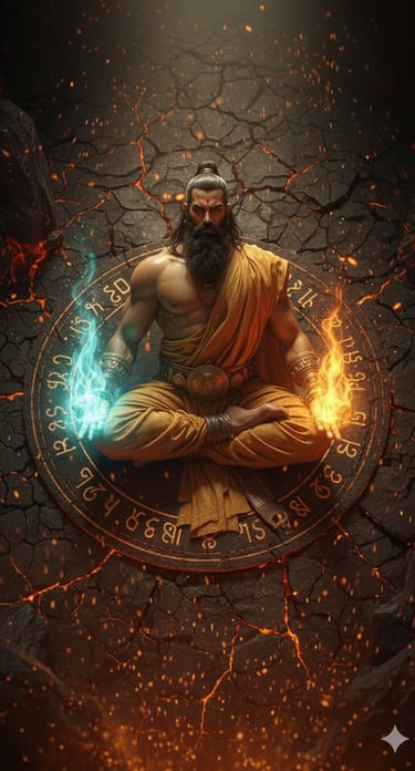Once awareness crystallizes, his Icchā-Bindu—the seed of intent—forms within his heart. This is not a mere decision to attack or defend, but a conscious alignment of will with the Dharma-stream, ensuring that whatever manifests is not born of ego but of universal necessity. The Mudrā-Saṅgati follows—a sequence of symbolic hand gestures, staff movements, or body postures that channel his intent into the language of creation, unlocking specific cosmic currents.