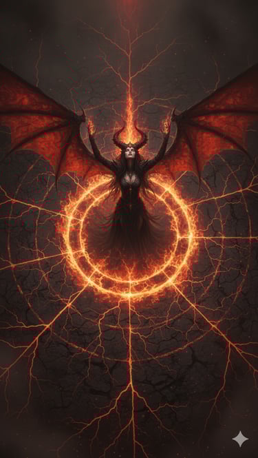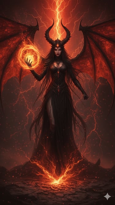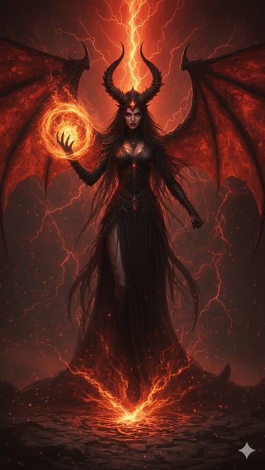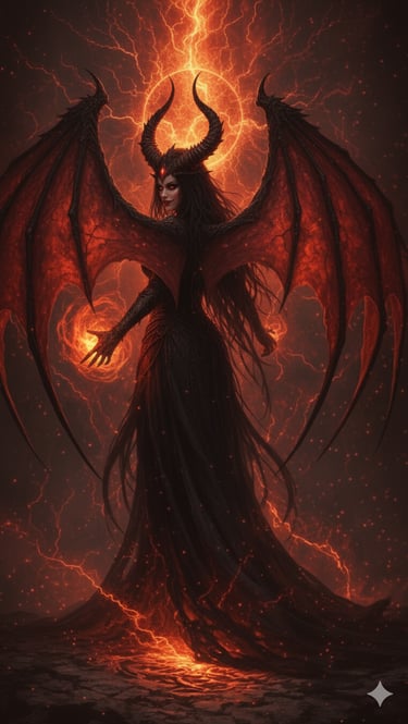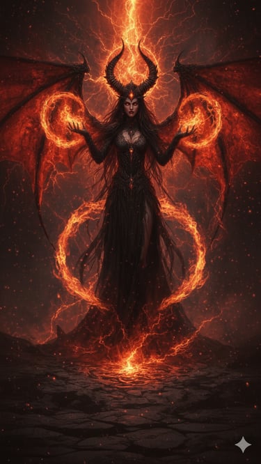 Her archetype is the Queen of Enslavement and Shadow, a sovereign who commands without raising her voice and conquers without drawing a blade. She is the stillness of night that conceals a thousand eyes, the whisper of dread that erodes defiance, the unseen hand that guides choices until all paths lead to her. She walks as one, yet within her moves an ocean — the Piśhāchasāgar — a boundless legion of nightmare beings carried in her essence.