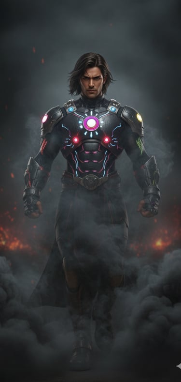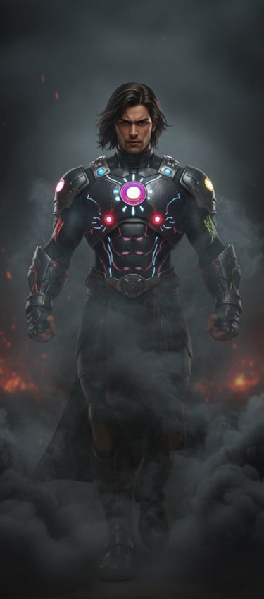 Chāyā-Agni Veil – Shadowfire Cloak: For Him: A mantle of blackfire and smoke cloaks his form, hiding his movements as he attacks. For Allies: When they pass near him, the cloak bends around them too, making them briefly invisible within the chaos.